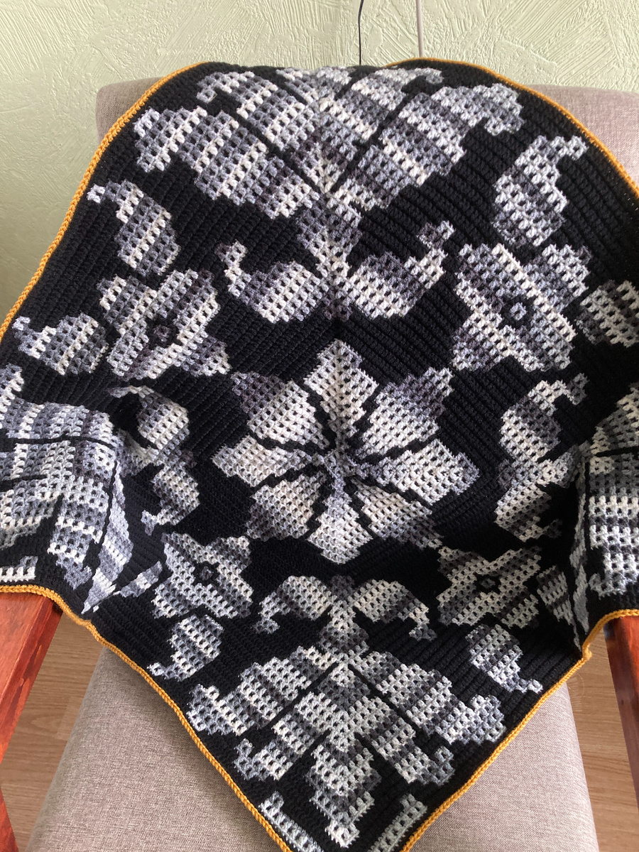 на основе схемы "Волшебные цветы". Меня попросили связать накидку размером 60 на 60 сантиметров, решила совместить приятное с полезным: связать накидку одним мозаичным квадратом. В моей копилке схем для мозаичных мотивов как раз нашлась схема соответствующего размера. Квадратный мотив такого размера (75 рядов плюс ряд обвязки) я ещё не вязала, было интересно, как будет смотреться узор и как сложно или нет вязать такой большой мотив по кругу, если в дальнейшем появится желание связать плед одним квадратом, к примеру. Когда связала полностью мотив, как то само собой захотелось добавить ряд обвязки, связала просто ещё один ряд мозаичными столбиками без накида пряжей контрастного цвета (в моём случае пряжа горчичного цвета). Вязала из пряжи Ализе суперлана классик крючком номер три, размер мотива получился 65 сантиметров. Способ вязания выбрала мой любимый: узор вязала в "вафельной" технике, а фон мотива - в "гобеленовой" технике. Эта мозаичная схема немного отличается от первоначальной