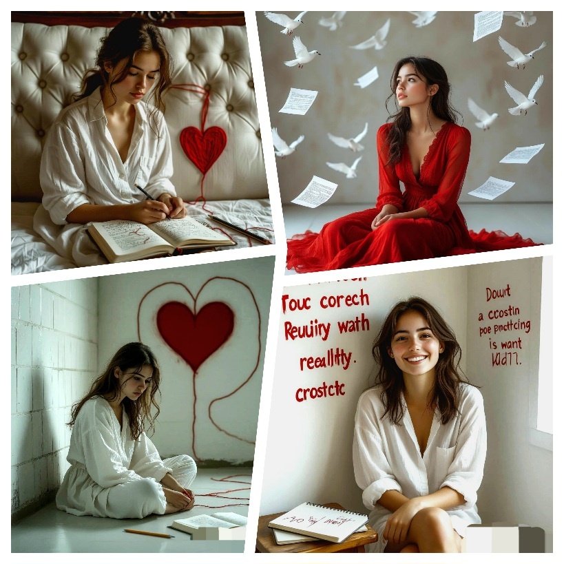 1. Вначале — я с блокнотом и сердцем из нити. Всё начинается со строк и попытки записать то, что болит.