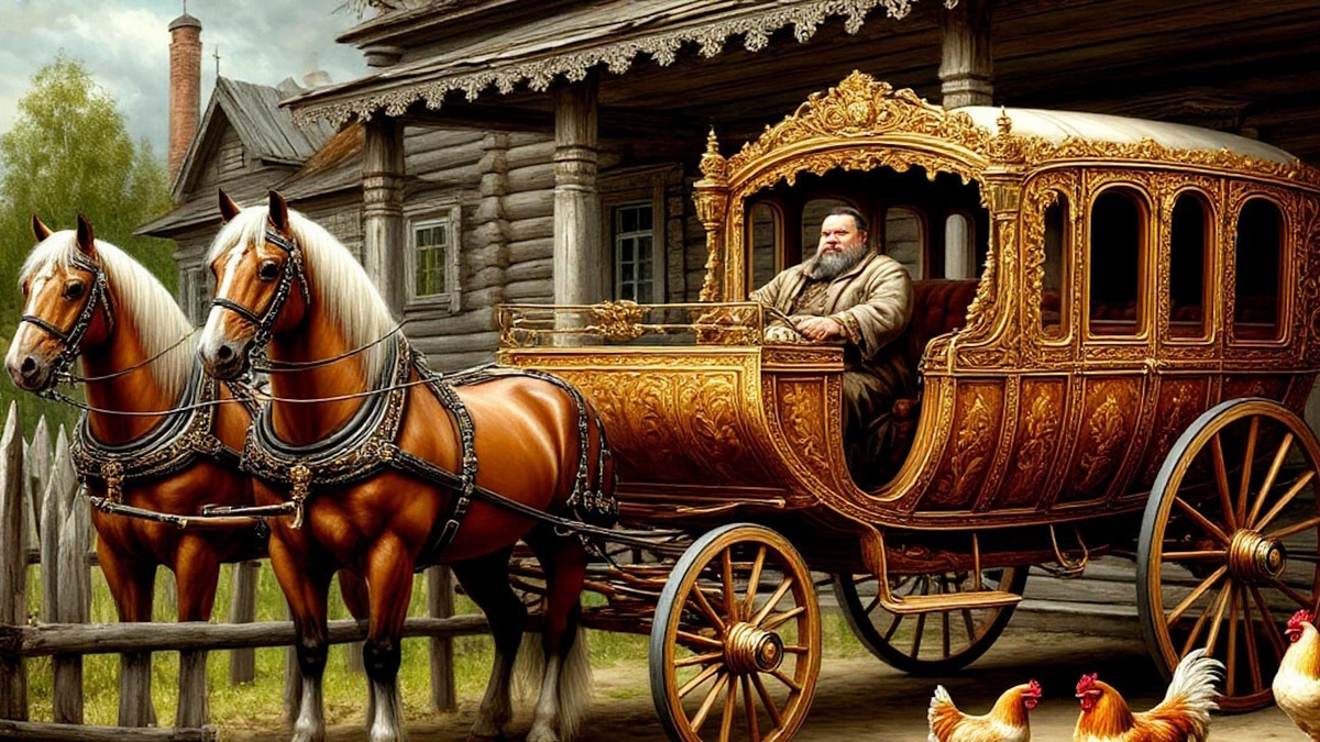 Во дворе стояла карета. Не простая телега, а настоящая, резная, с позолотой, запряжённая четвёркой лошадей. Лошади были холёные, с лоснящимися боками и высокомерными мордами. Они явно презирали моих кур и покосившийся забор. Рядом с каретой застыли два здоровенных холопа в одинаковых кафтанах — вылитые охранники из 90-х, только вместо «меринов» у них лошади.