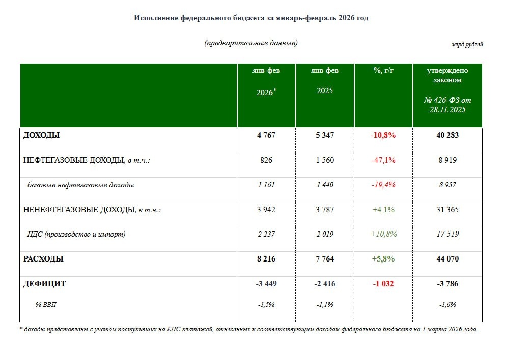 По предварительной оценке Министерства финансов, федеральный бюджет России за январь-февраль 2026 года выполнен с дефицитом в сумме 3,449 триллиона рублей, что составляет около 1,5% валового внутреннего продукта (ВВП). По закону о федеральном бюджете на весь 2026 год предусмотрен дефицит в объеме 3,786 трлн рублей, или 1,6% ВВП. 😀😃 Подписывайтесь на наш канал