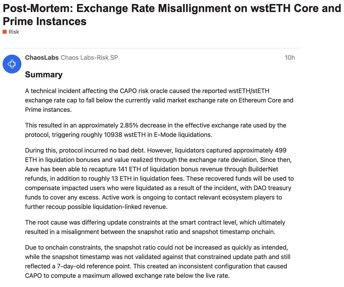 ❌ В Aave произошел сбой оракула, который привел к ликвидациям позиций wstETH на ~$26m. Ошибка возникла в механизме CAPO (Correlated Asset Price Oracle) – защитном оракуле, который ограничивает резкие скачки цен. В результате было ликвидировано 10,938 wstETH ($26m). В Aave уже заявили, что пострадавшие пользователи получат компенсации. Crypto Headlines