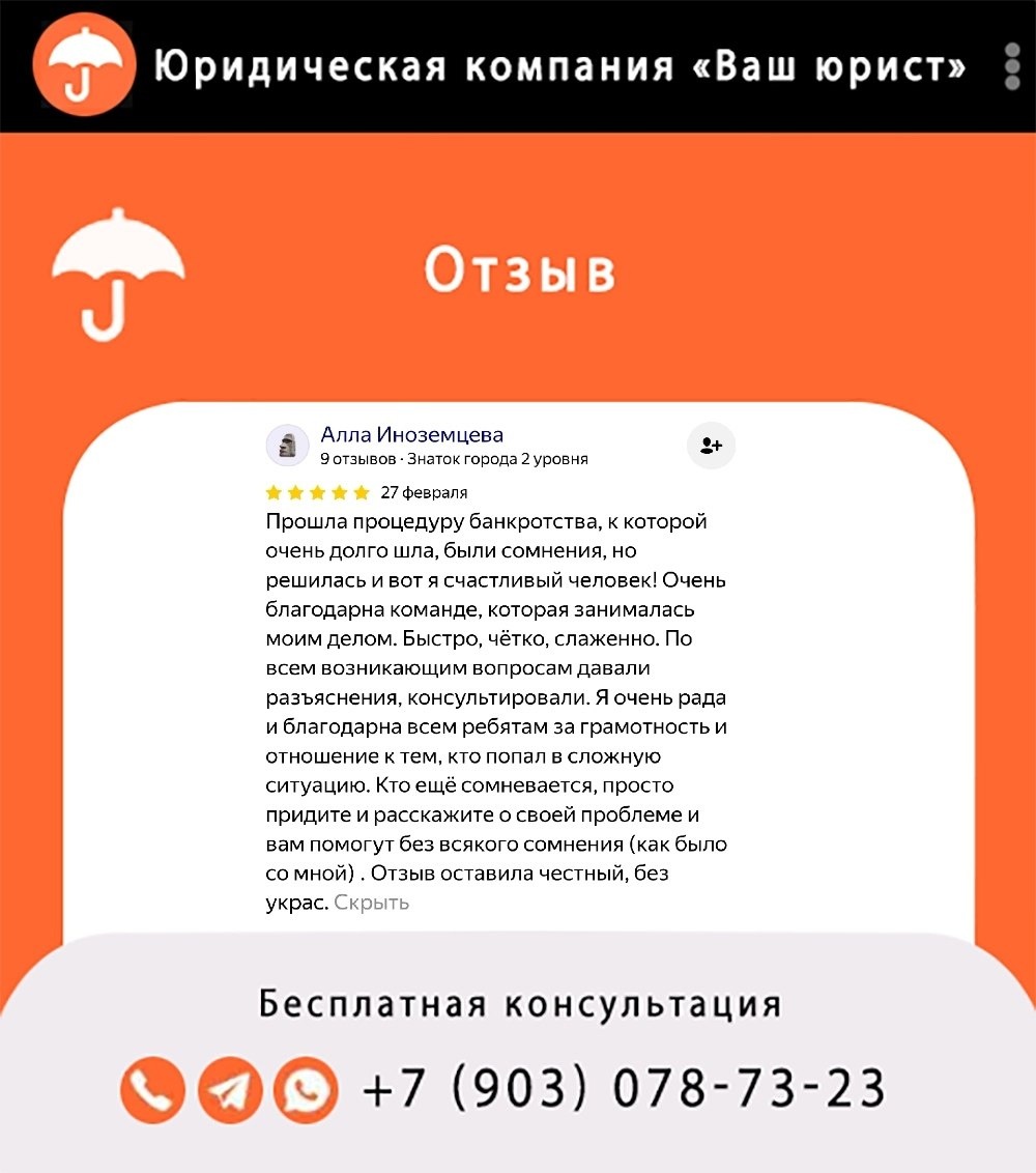 !🧡 Очень рады, что смогли оправдать ваше доверие и помочь в решении вопроса. Мы всегда стараемся делать всё возможное для наших клиентов — такие слова вдохновляют нас работать ещё лучше! С Уважением, команда ЮК "Ваш юрист".