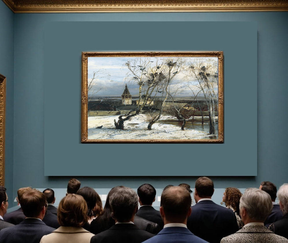 Вдали виднеются деревенские домики и колокольня. Небо пасмурное, серое, но чувствуется, что воздух стал весенним и свежим .