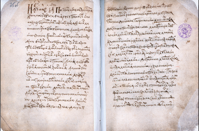 Дворовому месту длина двенатцать сажен, поперег тож. Да у него ж двор на Охтае – от города шесть верст. А во дворе живет сам з детми. А у двора на дуброве пашни паханые девять чети в поле, а в дву потому ж. Да заложные непаханые земли с причистью десять чети в поле, а в дву потому ж – земля середняя. Да сенных покосов сто тритцать копен. А оброку с тое пашни и сенных покосов нет. А он же, Гришка, с вагуличи торгует и всякую мяхкую рухлядь и кожи лосины (так!) покупает и руским торговым людем продает. И сам Гришка по государеву крестному целованию сказал, что торгу ево есть на пятнатцать рублев. И с того-де на гостине дворе государевы пошлины платит, и тому-де есть книги.