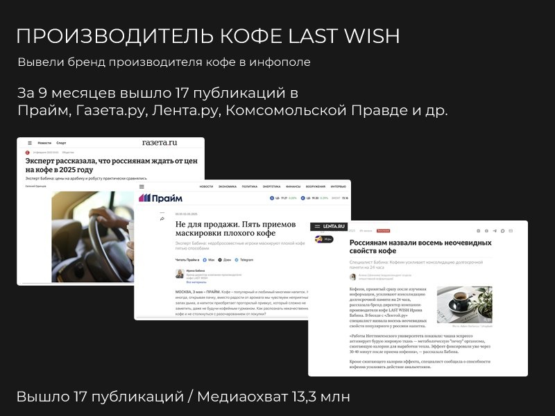 : Производитель кофе Last Wish Задача: Вывести в инфополе бренд компании Решение: Было принято решение продвигаться через экспертные в топовых СМИ, таких как Gazeta, Lenta, Прайм. Дополнительно: 1️⃣ 3 публикации в журнале Красота и здоровье 2️⃣ 1 статья в Комсомольской Правде 3️⃣ 2 материала в NGS.ru 4️⃣ 1 публикация в Parents.ru Результат: 17 публикаций с охватом 13,3 млн Кидайте 🔥 и пишите согласны ли вы или нет в комментариях 👉 Подписаться на канал пиарщика Алексея Чернышова