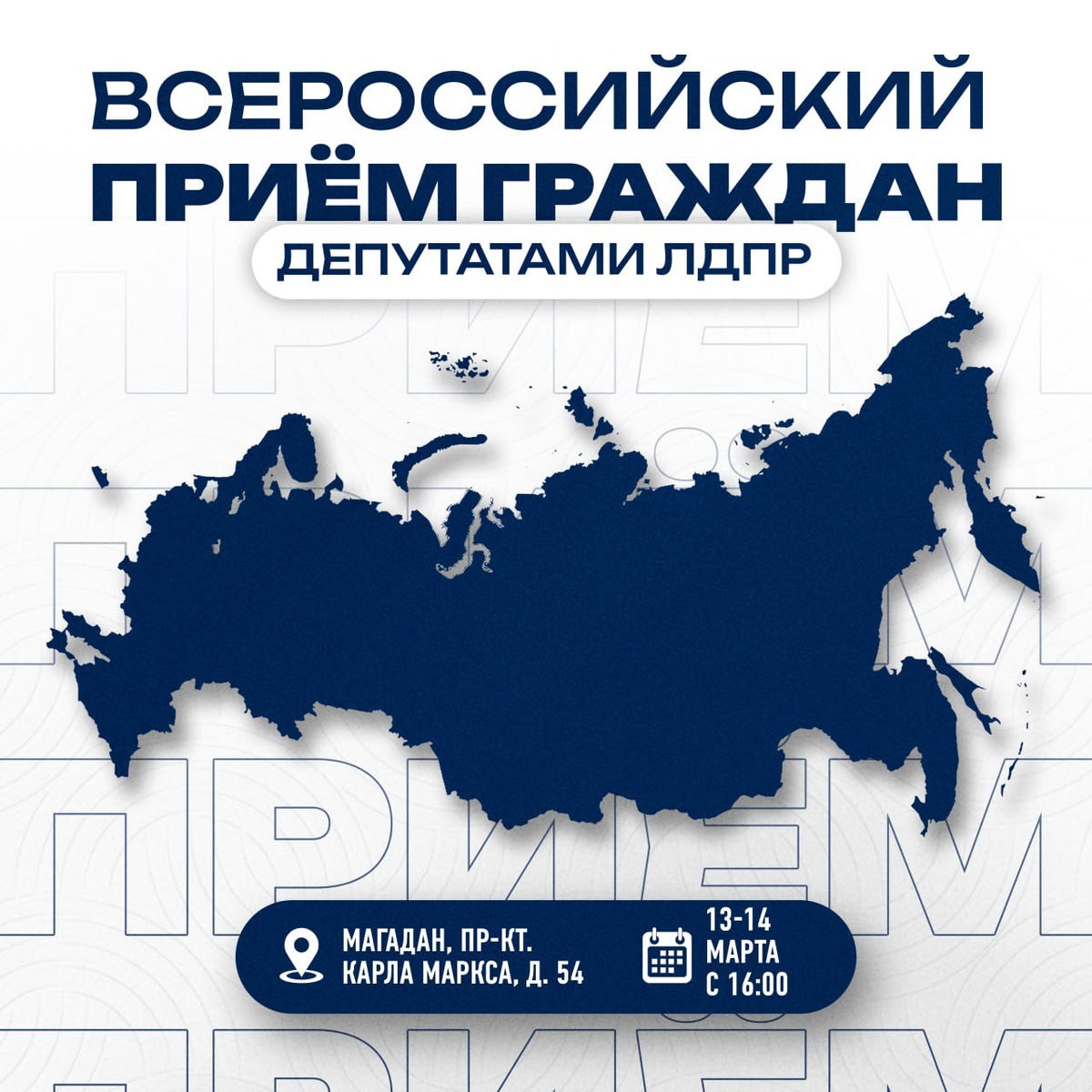 ! 13 и 14 марта (пятница и суббота) в региональном отделении ЛДПР состоится Всероссийский приём граждан. Это отличная возможность лично пообщаться с депутатами Магаданской областной Думы и опытными юристами✨✨✨ Вы сможете задать интересующие вас вопросы, поделиться предложениями и получить квалифицированную юридическую консультацию. ✅ Приём также будет организован депутатами ЛДПР в посёлках Омсукчан, Эвенск и Армань. 📝 Ваше мнение важно для нас! Присоединяйтесь — вместе сделаем Магаданскую область лучше. ‼️‼️‼️‼️‼️ Для участия необходима предварительная запись. ⏰ Время проведения: с 16:00 до 19:00 📍 Адрес: проспект Карла Маркса, 54, штаб ЛДПР ☎️ Записаться можно по телефонам: +7(914)854-20-99, 8(4132)62-83-56 🔗 Социальные сети 🌐 Сайт ЛДПР | Магадан