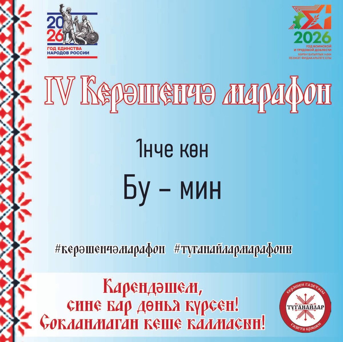 !💥 ✅Беренче көн темасы: БУ - МИН Марафонны танышу постыннан башлап җибәрәбез. Үзегез, кайдан булуыгыз, гаиләгез, населегез, яраткан шөгылегез, эшегез турында языгыз. Аерым бер кысалар юк: үз аккаунтыгызга #керәшенчәмарафон #туганайлармарафоны хештеглары белән бүгенге теманы ачучы текст яки текст һәм фотолар, хәтта видео да урнаштыра аласыз. Үзегезгә уңайлы вариантны сайлагыз. Игътибар! Видео төшерергә уйласагыз, аның 2 минуттан да артмавы шарт. 📌 Исегезгә төшерәбез! Катнашу өчен: 1. Безнең “ТУГАНАЙЛАР – газета кряшен” (https://vk.com/tuganaylar) төркеменә язылыгыз. 2. Әлеге постка комментарийларда ИСЕМ ФАМИЛИЯ, кайсы төбәктән булуыгызны языгыз. 3. Бу постка РЕПОСТ ясагыз (аккаунтыгыз ачык булырга тиеш) Марафонда керәшеннәр катнаша ала. Катнашу шартлары: ✅11 марттан башлап, 15 көн дәвамында һәр иртә безнең төркемдә махсус марафон өчен бер тема тәкъдим ителәчәк. Әлеге темага постларны (текст, фото, видео) үзегезнең ВКонтакте битегездә, көнендә язып барырга тырышыгыз. Барлык постл