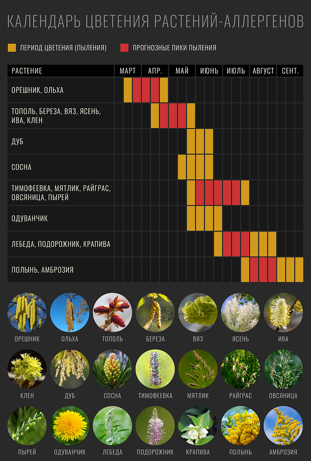 Точные данные о цветении растений можно можно получить на карте прогноза пыления, на информационном портале для аллергиков «Аллерготоп» или даже сайте Gismeteo: там публикуются последние и точные данные о концентрации конкретного аллергена (количество пыльцевых зерен в кубометре воздуха). Информация будет полезна, в том числе, для планирования поездок и отпусков в другие регионы.