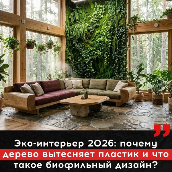 ? Если 2024–2025 годы были временем отказа от пакетов, то в 2026-м экология окончательно пришла в наши интерьеры. Сегодня ответственный подход к быту — это не только сортировка мусора, но и создание здоровой среды в собственной квартире. Главные тренды экологичного быта в этом году: ☑️Прощание с ПВХ и пластиком В 2026 году дизайнеры и производители мебели фиксируют резкий отказ от искусственных покрытий. Пластиковые фасады и виниловые обои уступают место натуральному дереву, пробке и камню. ☑️Биофильный дизайн — природа внутри дома Это не просто пара горшков на подоконнике. Тренд 2026 года — фитостены (вертикальное озеленение) и использование природных фракталов в отделке. Польза: Растения работают как естественные фильтры и увлажнители, поглощая углекислый газ и снижая уровень стресса. Ученые доказали, что даже 15 минут в окружении живой зелени снижают уровень кортизола на 12%. ☑️Циркадное освещение и экономия Умные дома 2026 года стали доступнее. Теперь интеллектуальные системы