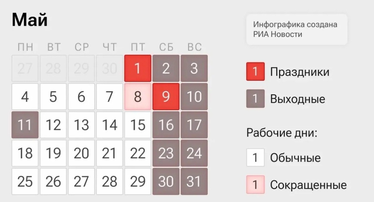 Майские праздники в 2026 году пройдут в два этапа — с 1 по 3 и с 9 по 11. С 4 по 8 мая будут рабочие дни.