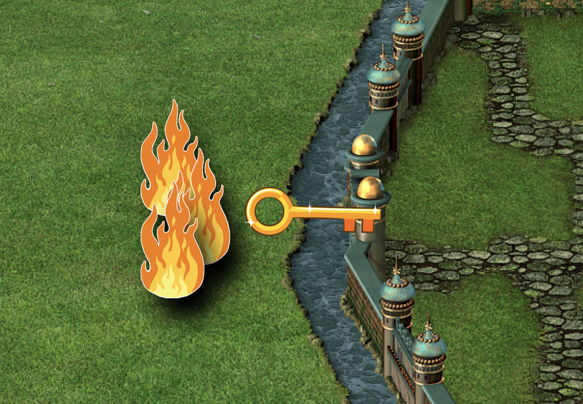 Иногда нужен не ключ для отпирания, а смекалка. Недавно смотрел игру сэра Троглодита за Кронверк, где ему противостояло несколько сложных компов, и мне в память врезалась одна любопытная осада. Спадум, у которого был небольшой отряд, включая двух дьяволов, трёх титанов и трёх ифритов-султанов (и ещё мелочёвка), напал на замок Кронверка. У компьютерного соперника армия тоже не была большой, но они находились за стенами, а Троглодита каждый ход обстреливали лучники, или вернее копейщики с башен. Ифрит и дьявол, разумеется, бросились вперёд. Ифрита он скоро потерял и остался один дьявол с косой, и лишь вопрос времени, когда от авангарда останется мокрое место. А как только герой потеряет летунов, оставшихся без проблем раскатают башни — армия-то небольшая, не получится дождаться, пока катапульта сделает своё дело. И тут Троглодит пошёл на хитрость: поставил дьяволов в укромное местечко у ворот и создал перед ними Стену огня, причём базового уровня — двухклеточную. И тут-то карты ем