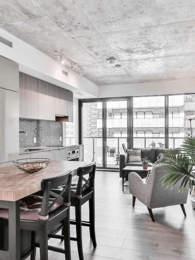 Разные напольные покрытия могут четко обозначить границы между зонами. Например, на кухне можно использовать плитку, а в зоне столовой — деревянные полы. Такое сочетание материалов привносит в интер