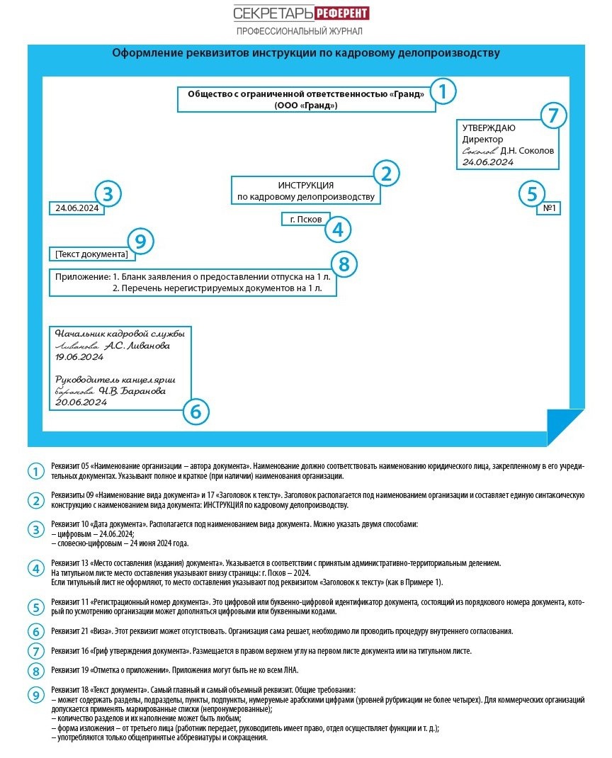 При оформлении любого документа используется определенный набор реквизитов. Приведем фрагмент инструкции по кадровому делопроизводству с указанием реквизитов в соответствии с ГОСТ Р 7.0.97-2025 (Пример).