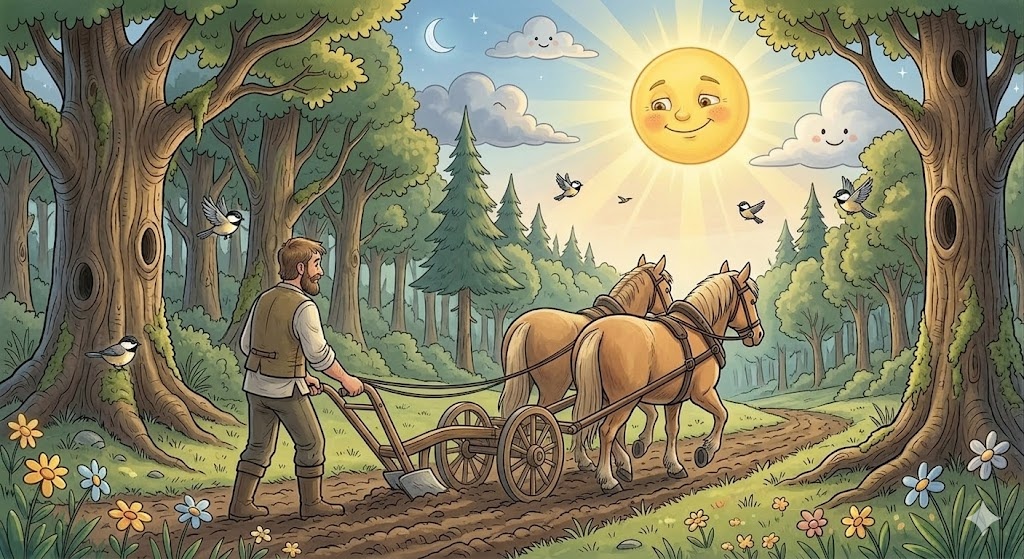 Мужик поехал в лес репу сеять. Пашет там да работает. Пришёл к нему медведь: — Мужик, я тебя сломаю. — Не ломай меня, медведюшка, лучше давай вместе репу сеять. Я себе возьму хоть корешки, тебе отдам вершки. — Быть так, — сказал медведь. — А коли обманешь, так в лес ко мне хоть не езди. Сказал и ушёл в дуброву. Репа выросла крупная. Мужик приехал осенью копать репу. А медведь из дубровы вылезает: — Мужик, давай репу делить, мою долю подавай. — Ладно, медведюшка, давай делить: тебе вершки, мне корешки. Отдал мужик медведю всю ботву. А репу наклал на воз и повёз в город продавать. Навстречу ему медведь: — Мужик, куда ты едешь? — Еду, медведюшка, в город корешки продавать. — Дай-ка попробовать — каков корешок? Мужик дал ему репу. Медведь как съел: — А-а! — заревел. — Мужик, обманул ты меня! Твои корешки сладень- ки. Теперь не езжай ко мне в лес по дрова, а то заломаю. На другой год мужик посеял на том месте рожь. Приехал жать, а уж медведь его дожидается: — Теперь меня, мужик, не обманешь