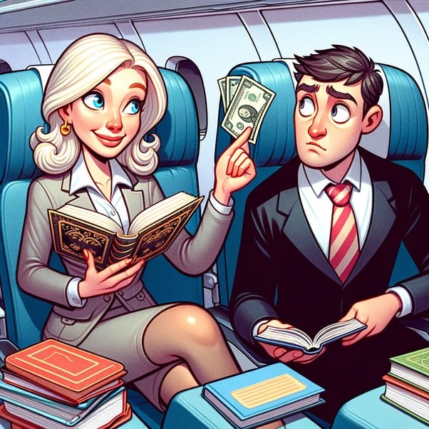 Блондинка садится в самолете и начинает читать книгу, но сидящий рядом с ней мужчина, адвокат, не дает ей покоя. Наконец, он говорит ей: «Давай сыграем в игру. Я задам тебе вопрос, и если ты не сможешь на него ответить, ты будешь должна мне пять долларов. Потом ты задашь мне вопрос, и я не смогу на него ответить, я буду должен тебе тысячу долларов». Блондинка говорит: «Хорошо». Адвокат спрашивает: «Каково расстояние от Земли до Луны?» Не говоря ни слова, блондинка открывает сумочку, достает пятидолларовую купюру и протягивает его ему. Затем она спрашивает: «Что поднимается на холм на трех ногах и спускается на двух?» Адвокат задумывается; он ищет информацию в интернете; звонит друзьям и спрашивает у них, но ничего не находит, и вручает блондинке тысячу долларов. Она кладет их в сумочку и возвращается к чтению. Адвокат спрашивает: «Эй! А какой ответ?» Не говоря ни слова, блондинка открывает сумочку, достает пятидолларовую купюру и протягивает ее ему.