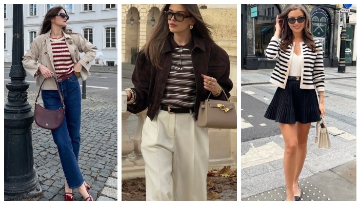 Весна — идеальное время для принта, который никогда не выходит из моды. Полоска каждый сезон возвращается на подиумы и в гардеробы модниц, но именно весной она выглядит особенно свежо. Разберём на примерах, как стилизовать полоску так, чтобы образ выглядел современно, дорого и немного по-французски. Свободный джемпер в тонкую полоску отлично работает с голубыми джинсами прямого кроя. Такой образ выглядит расслабленно и очень по-весеннему. Белая рубашка, выглядывающая из-под джемпера, добавляет многослойности, а коричневые лоферы и сумка поддерживают элегантную палитру. Это тот случай, когда простота делает образ максимально стильным. Тонкий полосатый джемпер легко превращает повседневный образ в атмосферу парижского утра. Кремовые брюки с высокой посадкой делают силуэт элегантным, а очки в ретро-оправе усиливают интеллектуальное настроение. Такие комплекты выглядят особенно эффектно в спокойной гамме: шоколад, молочный, бежевый. Если хочется добавить образу немного игривости, сочетайте