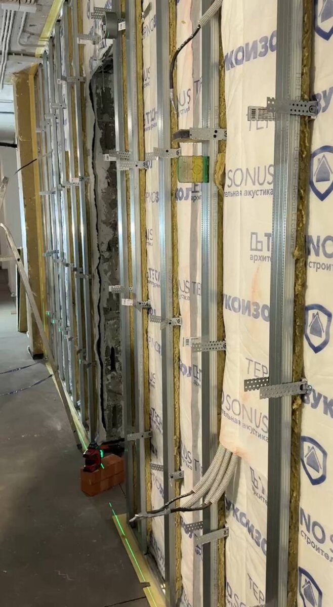 Хочу рассказать, как на практике устанавливается звукоизоляция в квартире. Сейчас мы работаем на объекте на улице Улица Щапова по проекту дизайнера Родион Давыдов. Сейчас как раз идёт этап звукоизоляции — один из самых важных в ремонте 🏗 1️⃣ Устанавливаем систему звукоизоляции Первый шаг — монтаж звукоизоляционной системы. В этом проекте мы используем материалы компании TechnoSonus. Эти решения хорошо показывают себя в реальных квартирах и помогают значительно снизить уровень шума 👍 2️⃣ Монтируем каркас на виброподвесах Дальше устанавливается металлический каркас будущей стены. Но крепится он не напрямую к стене, а через специальные виброподвесы. Зачем это нужно? 🤔 Такие подвесы уменьшают передачу вибраций и шума через конструкцию. Это один из ключевых элементов хорошей звукоизоляции. 3️⃣ Выставляем каркас по уровню После монтажа каркас аккуратно выставляется по плоскости и по уровню. Это важно не только для звукоизоляции, но и для будущей отделки стен. 4️⃣ Заполняем конструкцию мат