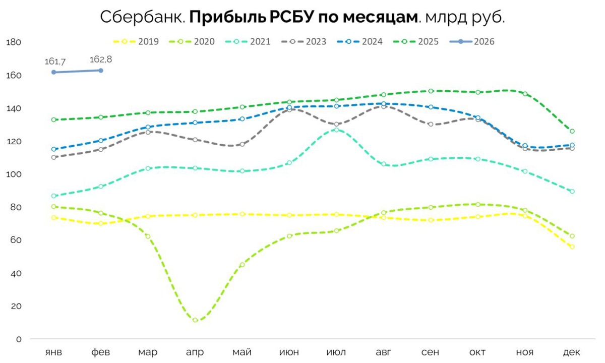 ? В феврале банк получил 33,5 млрд руб. прочих небанковских доходов. Чистая прибыль составила 162,8 млрд руб. при ROE - 24,1%. Капитал на акцию по РСБУ, как и предполагали, вырос в феврале до 352,3 руб. По оценке: P/B ~ 0,89x и P/E ~ 4,05x. О темпах роста: предполагаем, что в течение года темпы роста прибыли будут постепенно снижаться: 21,7% в январе, 21,1% в феврале и по году приблизятся к 13-15% г/г. Однако сейчас (не будем скрывать то, что все и так знают) Сбер остается одной из лучших голубых фишек, да и к тому же с приличной дивидендной доходностью. 💬 Telegram | 📺YouTube|💰Private-чат