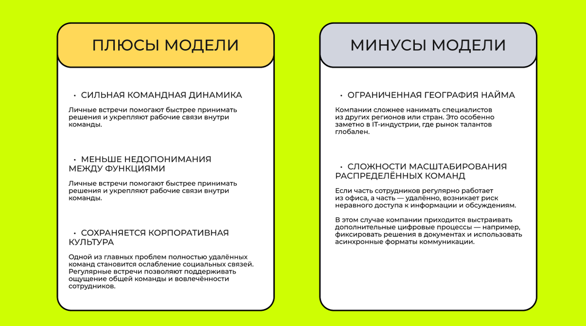 Когда разные команды работают в разных режимах, компании становится сложнее поддерживать единое ощущение корпоративной культуры. У сотрудников могут формироваться разные ожидания от работы и разные стили коммуникации. В результате внутри организации иногда возникает эффект «двух культур»: более автономных распределенных команд и подразделений, которые остаются привязанными к офису.