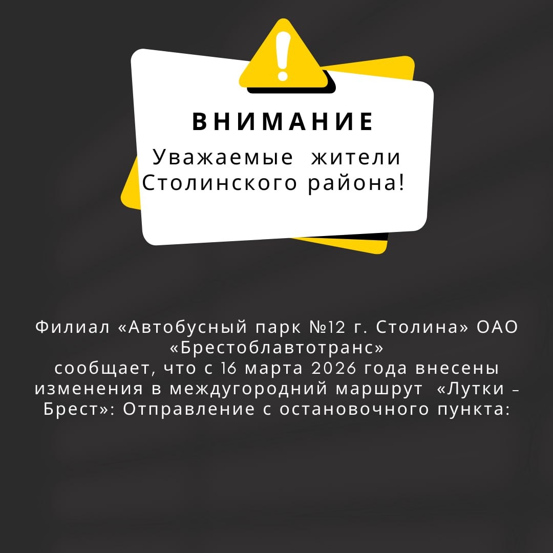 Столина» ОАО «Брестоблавтотранс» сообщает, что с 16 марта 2026 года внесены изменения в междугородний маршрут «Лутки – Брест»: Отправление с остановочного пункта: Лутки – 6.00. Большое Малешево – 6.27. Ольшаны – 6.43 АС Давид-Городок – 7.05. Бережное – 7.30. АВ г. Столина – 8.15. Глинка – 8.29. Федоры – 8.50. Отправление: АВ г. Бреста – 15.50. АВ Кобрин – 16.50. Дрогичин – 17.56. Иваново – 18.20. Прибытие: АВ г. Столина – 20.10. АС Давид-Городок – 20.58. Ольшаны – 21.13.