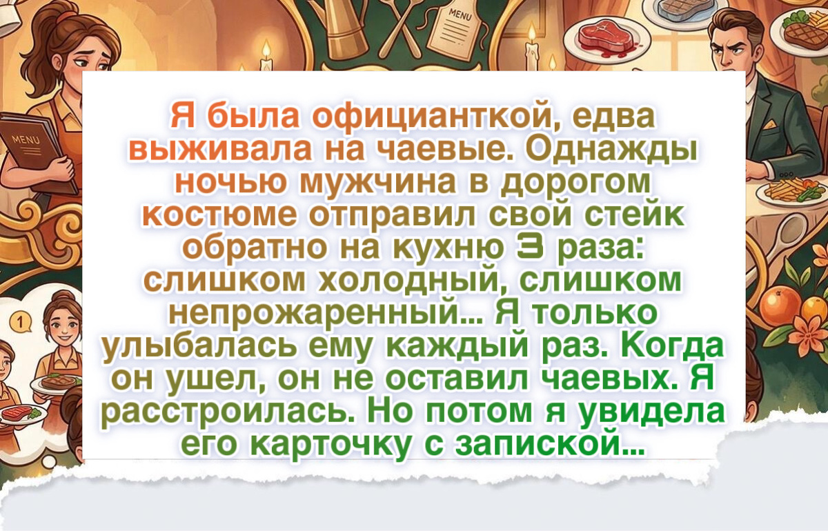 “Я была официанткой, еле сводила концы с концами на чаевых. Однажды мужчина в дорогом костюме трижды возвращал свой стейк: слишком сырой, слишком холодный, не с той стороны. Весь персонал его ненавидел. Я улыбалась и приносила ровно то, что он просил. Когда он ушёл, на чеке было 0 рублей чаевых. Я с горечью убрала посуду и заметила под тарелкой визитку с запиской: ‘У тебя больше терпения, чем у половины моих руководителей. Позвони в понедельник.’ Я позвонила. Он предложил мне младшую должность в своей маркетинговой фирме. Сейчас я директор по работе с клиентами. Этот стейк оказался тестом, о котором я не знала.”