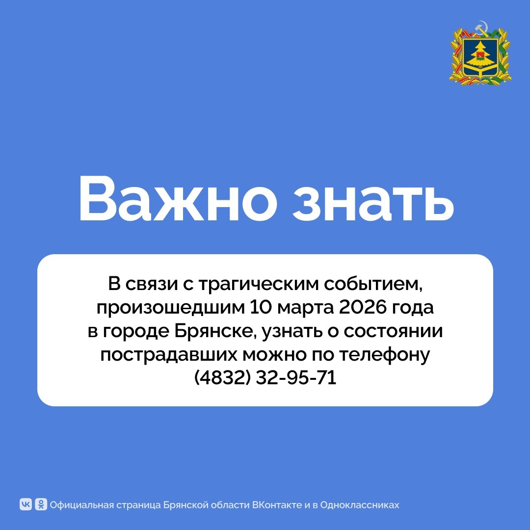✅В Брянске на базе областной больницы №1 работает горячая линия, по номеру (4832) 32-95-71 можно узнать о состоянии пострадавших