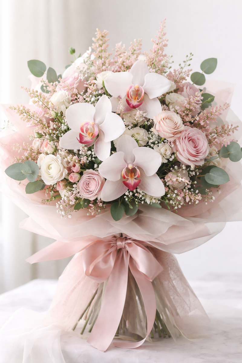 Именно поэтому составление букета с орхидеями лучше доверить опытному флористу. Специалист сможет не только подобрать гармоничное сочетание цветов, но и учтёт повод, настроение подарка и индивидуальные пожелания клиента.
