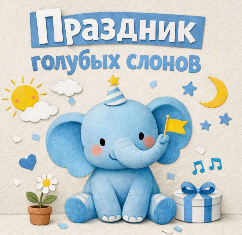 Праздник голубых слонов отмечается 11 марта и посвящён фантазии, творчеству, мечтам и нестандартному мышлению. Это неформальный праздник, который не имеет строгого регламента, но стал поводом для радости, самовыражения и общения. Точная история возникновения праздника остаётся загадкой. Есть несколько версий: Голубой слон в этом контексте — символ детской мечты, чего-то волшебного и недостижимого. Голубой цвет ассоциируется с небом, бесконечностью, волшебством, спокойствием и мудростью. Образ слона символизирует интеллект, долголетие и силу духа. Соединение этих образов подчёркивает идею о том, что мир полон сюрпризов, а иногда стоит мыслить нестандартно. Важно отметить, что голубых слонов в природе не существует — это образ, который помогает привлечь внимание к теме через игру и творчество. Традиции сложились преимущественно неформальные, основанные на фантазии и позитиве: Для детей и семей: Для взрослых: Экологическая составляющая: В некоторых библиотеках и культурных учреждениях в