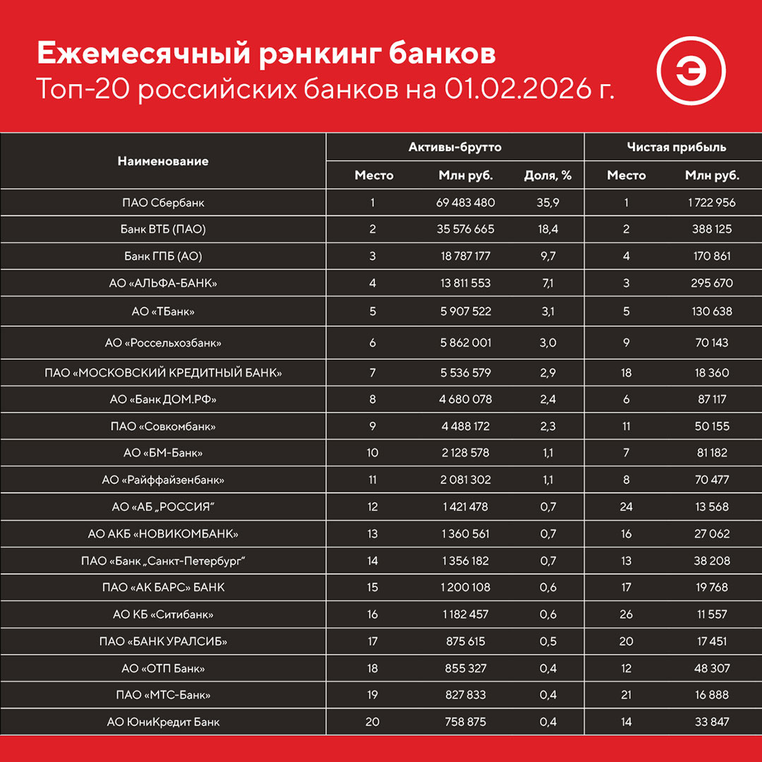 мы возобновили публикацию ежемесячных рэнкингов российских банков. 🔍🔍🔍🔍🔍🔍Сегодня вышел очередной выпуск – на 1 февраля 2026 г. 📉 По расчетам агентства, на 1 февраля 2026 года совокупные активы банков – участников рэнкинга составили 193 против 195 трлн рублей на 01.01.2026 (снижение в пределах 1%). Большую часть указанной динамики обеспечил «Сбербанк», чьи активы сократились на 562 млрд рублей. ➖Среди 20 крупнейших игроков снижение активов как в абсолютном, так и в относительном выражении продемонстрировали «Совкомбанк» (-262 млрд рублей/-5,5%), «Россельхозбанк» (-245 млрд рублей/-4%), «МКБ» (-152,5 млрд рублей/-2,7%), «НОВИКОМБАНК» (-130 млрд рублей/-8,7%). ➕ Положительную динамику при этом показал «Банк ДОМ.РФ», увеличив активы на 126 млрд рублей (+2,8% за январь). Совокупный финансовый результат банков – участников рэнкинга за 12 месяцев, предшествующих 01.02.2026, составил 3,73 трлн рублей (против 3,62 за 2025 год), что соответствует рентабельности по совокупному баланс