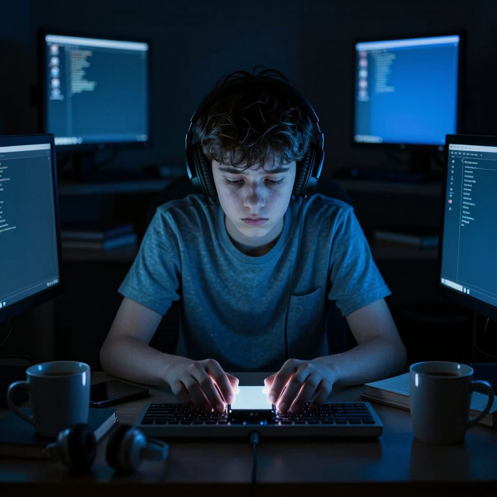 4. Циркадный сдвиг: Засыпание под утро — классический признак синдрома задержки фазы сна, усугубленного синим светом от экранов, который подавляет и без того слабую выработку мелатонина у подростков.