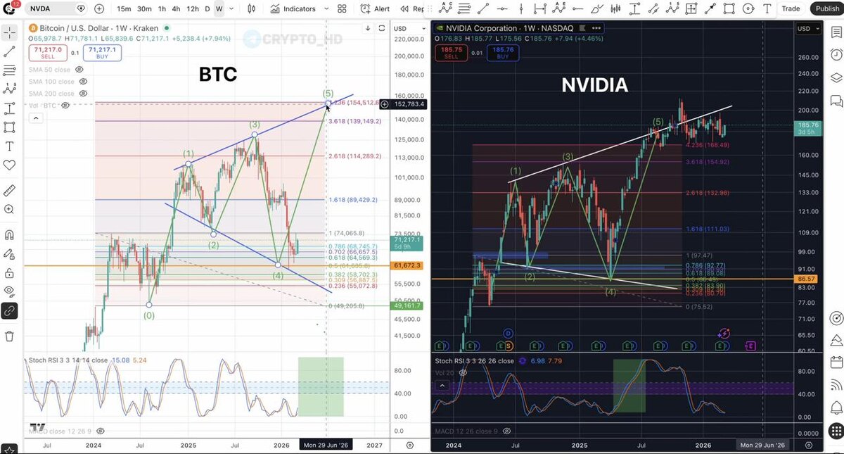🙂 Популярный график из Twitter с потенциальным ростом Биткоина до ~$150,000 – сравнивают текущую структуру движения BTC с тем, как ранее росли акции Nvidia. После текущей коррекции Биткоин может перейти к финальной импульсной волне роста. Crypto Headlines