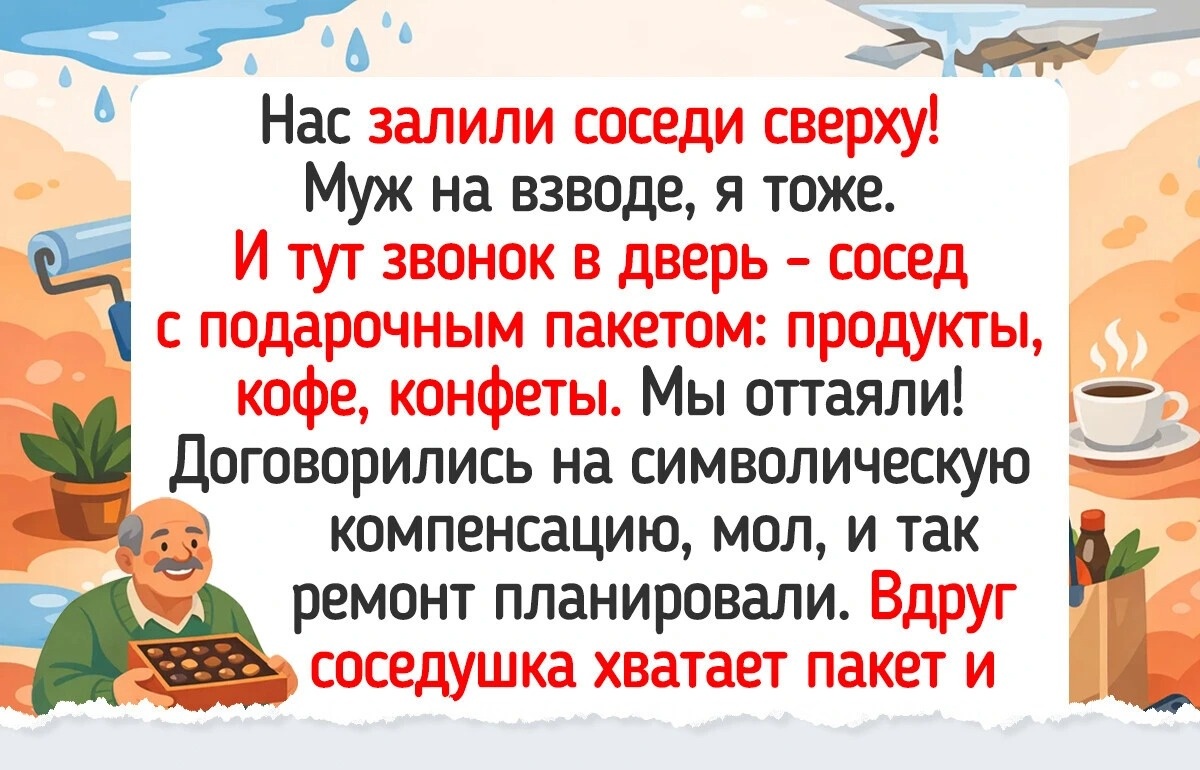 Нас залили соседи сверху! Муж на взводе, я тоже. И тут звонок в дверь — сосед с подарочным пакетом: продукты, кофе, конфеты. Мы оттаяли! Договорились на символическую компенсацию, мол, и так ремонт планировали. Вдруг соседушка хватает пакет и говорит: «Ну хорошо, а то я в гости опаздываю!»