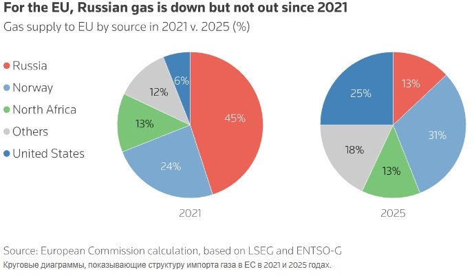 На текущий момент российский газ составляет около 10% от общего импорта в ЕС. Европейский Союз постановил, что к сентябрю 2027 года весь импорт российского газа будет прекращен, хотя юридические нюансы и возможные лазейки могут задержать этот процесс и продлить зависимость от российского газа до 2028 года.