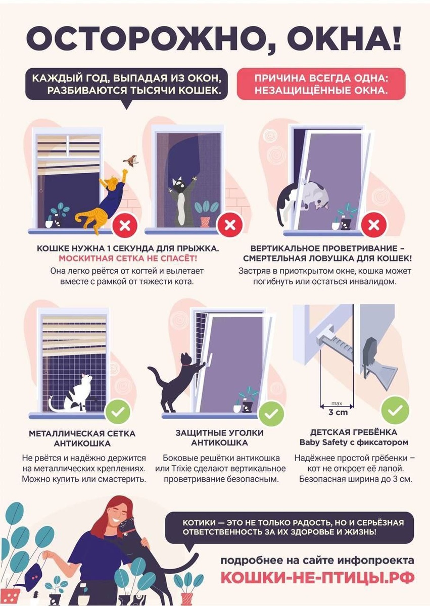 ... каждый из нас уже начинает открывать окна на проветривание и мы спешим ВНОВЬ и СНОВА напомнить всем Вам о том, что ‼️ОКНА - ОБЪЕКТ ПОВЫШЕННОЙ ОПАСНОСТИ для ДОМАШНЕГО ЖИВОТНОГО‼️ не только настежь открытое окно является НЕ безопасным, - вертикальное проветривание так же может нанести непоправимый вред здоровью, и как правило,в большинстве случаев застревание в вертикальном проветривании несет за собой летальный исход (( Поэтому стоит позаботиться о том, чтобы Ваш питомец был В БЕЗОПАСНОСТИ Пожалуйста, берегите, своих пушистиков🐱❣🙏