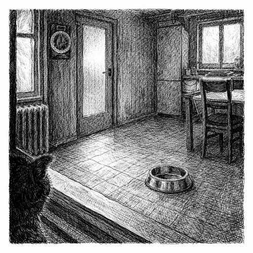 Семён проснулся на подоконнике и некоторое время слушал кухню. Утро обычно начиналось с мелких звуков: щёлкал холодильник, где-то капала вода, за окном ворчали голуби. Иногда в коридоре шуршали шаги. Тогда открывалась дверь, и жизнь приходила на кухню вместе с запахом кофе и пакета с кормом. Сегодня было тихо. Семён лежал, вытянув перед собой лапы, и смотрел на стол. Стол был на месте. Холодильник стоял у стены. Батарея под подоконником приятно грела. Всё выглядело как всегда. Он спрыгнул на пол. Миска стояла там же, у ножки стола. Алюминиевая, слегка помятая по краю. Семён подошёл к ней и заглянул внутрь. Миска была пустая. Семён немного подумал и аккуратно ударил лапой по кромке. Миска звякнула, поехала по кафелю и издала тот самый скользящий металлический звук, который всегда бесил хозяйку. Обычно после этого из коридора раздавалось раздражённое: — Семён! Потом она всё равно приходила, вздыхала и доставала из шкафа вкусняшку. Сегодня из коридора никто не сказал «Семён». Миска остано
