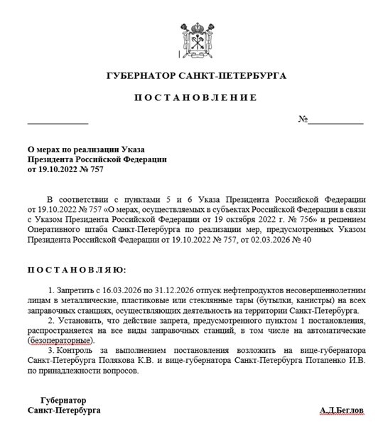 В Петербурге с 16 марта вступит в силу запрет о продаже несовершеннолетним бензина в любую тару на городских АЗС, соответствующий проект опубликован на сайте Смольного в разделе антикоррупционной экспертизы. Ранее запрет предлагали ввести с 9 марта. "Запретить с 16.03.2026 по 31.12.2026 отпуск нефтепродуктов несовершеннолетним лицам в металлические, пластиковые или стеклянные тары (бутылки, канистры) на всех заправочных станциях, осуществляющих деятельность на территории Санкт-Петербурга", — говорится в документе. Отмечается, что действие запрета распространяется на все виды заправочных станций, в том числе на автоматические. Контроль за выполнением постановления возложили на вице-губернаторов Петербурга Полякова и Потапенко. Недавно губернатор Петербурга Александр Беглов подписал решение городского Оперативного штаба о введении временного запрета на продажу топлива несовершеннолетним. Оно принято в рамках мер, предусмотренных Указом президента РФ от 19.10.2022 № 757 об усилении мер об