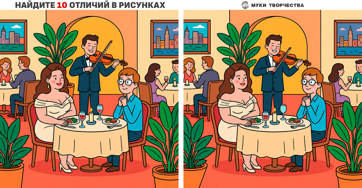 Хочется немного романтики. Поэтому сегодня в задании на внимание уютная сценка в ресторане. Застенчивый парень пригласил шикарную девушку провести с ним приятный вечер за ужином. Звучит приятная живая музыка, слышен звон бокалов, и всё располагает к интересному общению. Между двумя похожими картинками есть 10-ть отличий. Отложите на минутку свои дела и найдите все различия, которые сделал художник. Это интересное упражнение на концентрацию внимания и память помогает профилактировать проблемы с когнитивной функцией мозга в любом возрасте. На случай возникших трудностей с поиском оставлю ответ-подсказку в конце статьи. Но лучше используйте его просто для сверки своих предположений. Удачи! Горизонтальный вариант теста: Свидание в уютном ресторане Вертикальный вариант теста: Свидание в уютном ресторане Вау! ТУТ есть ещё больше тестов: ОТВЕТ-подсказка: