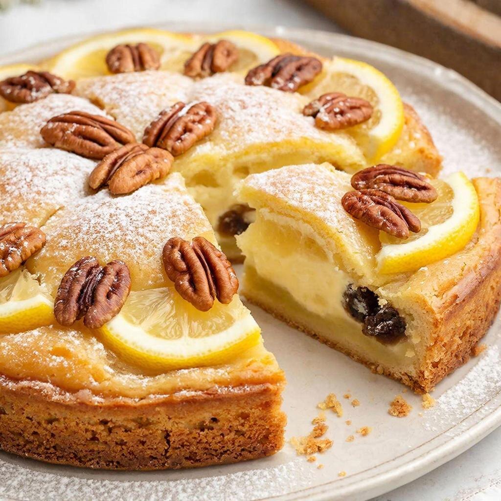 Масло растереть с сахаром, добавить яйца и сметану, измельченную цедру лимона, муку, смешанную с содой, быстро замесить тесто. Готовое тесто разделить на три части, раскатать и испечь. Лимоны пропустить через мясорубку вместе с изюмом, перемешать с сахаром. Охлажденные коржи положить друг на друга, промазав начинкой, верхний посыпать сахарной пудрой, украсить орехами. Ингредиенты: 3 стакана муки, 2 яйца, 300 г. сливочного масла или маргарина, 1 стакан сахара, 300 г. сметаны, сода (на кончике ножка), 1/2 стакана ядер грецкого ореха, 2 ст. ложки сахарной пудры. Начинка: 3 лимона, 2 стакана изюма, 1 стакан сахара.