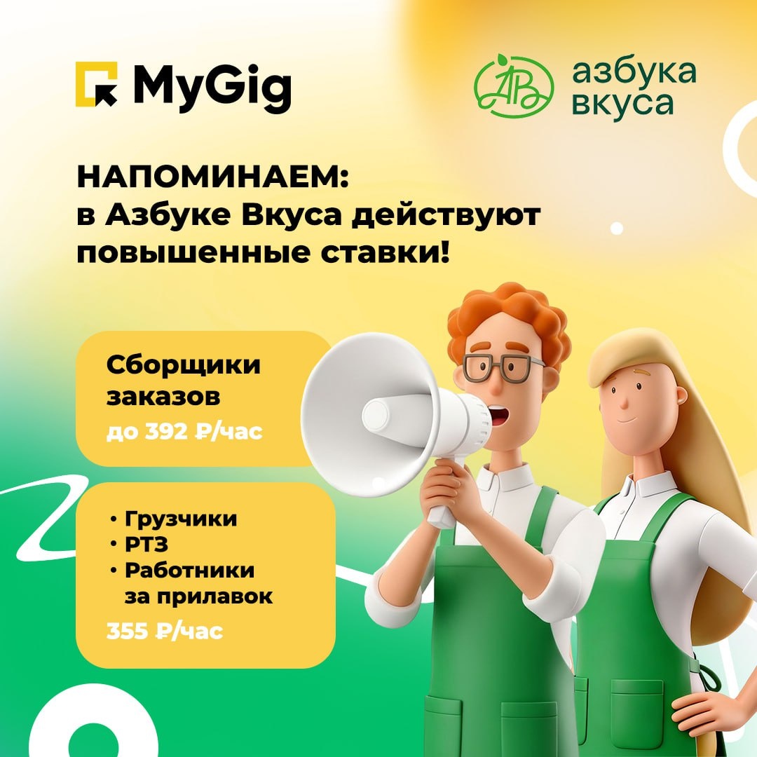 ! Не упустите шанс заработать больше — напоминаем, на данный момент в Азбуке Вкуса повышены ставки через MyGig ⬆️ Где и сколько платят? 🗺 Москва и область: • Сборщики заказов — 392 ₽/час • Работники торгового зала / за прилавок — 355 ₽/час • Грузчики — 355 ₽/час 🗺 Санкт-Петербург и область: • Сборщик заказов — 310 ₽/час Почему стоит забронировать сейчас: • Смены с гибким графиком — подстраиваемся под вас • Оплата каждый день — после подтверждения в приложении • Можно без опыта — инструктаж на месте 👉 Скорее в MyGig — пока есть места. Не откладывайте! 🤝 Уже подрабатываете в Азбуке Вкуса, но через другую платформу? Не видите смену рядом с вашим магазином в МСК/МО или СПБ/ЛО? Напишите нам в поддержку или в комментариях — поможем переключиться на MyGig и забронировать удобный слот! MyGig в MAX / ВКонтакте / Одноклассниках / Телеграм