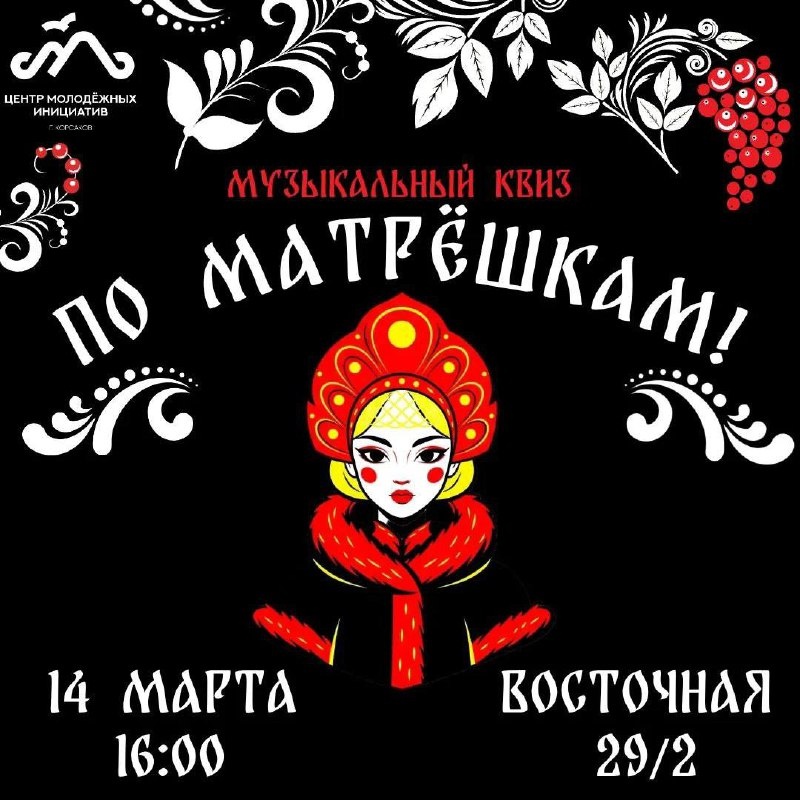 ! 🪆Всех желающих приглашают на задорный квиз по матрешкам 🤩Когда: 14 марта в 16:00 🤩Если любите песни от души и до мурашек петь, то собирайте скорей команду! 🤩Девицы-красавицы, доставайте платки да кокошники! 🤩Молодцы-удальцы, настрой боевой прихватывайте! 🤩Приходите семьями, компаниями, будет весело и задушевно! Зарегистрироваться можно тут. 🤩Важно: к участию в квизе принимаются команды по 4 человека. 🤩Вопросы по телефону 4-00-59 @cmi_korsakov65