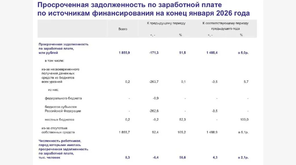 По данным Росстата, в январе суммарная просроченная задолженность по зарплате в России действительно выросла примерно в 5 раз — до 1,856 млрд рублей. Далее по доле долгов идут обрабатывающие производства (около 31%) и добыча полезных ископаемых (около 11%), то есть просрочки концентрируются в капиталоёмких отраслях с высокой долговой нагрузкой.