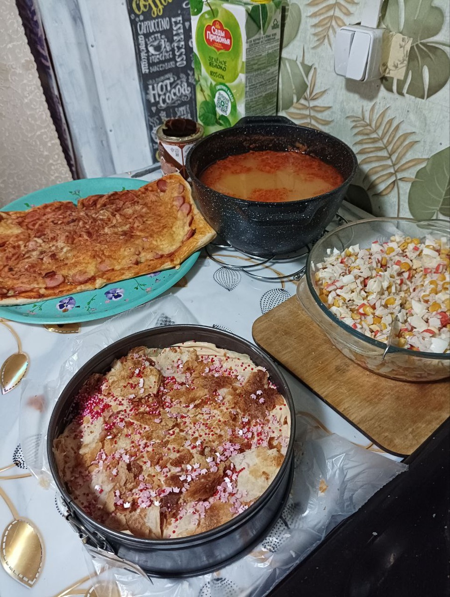 : -рассольник -Салат крабовый -Пицца -Что-то типа Наполеона.