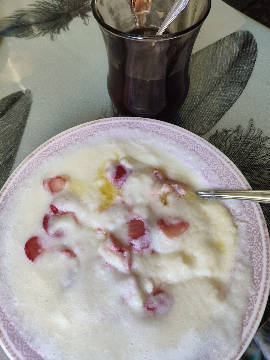 Манная каша с клубникой и кофе. Володя говорит, что я завтракаю как аристократка 🤣.