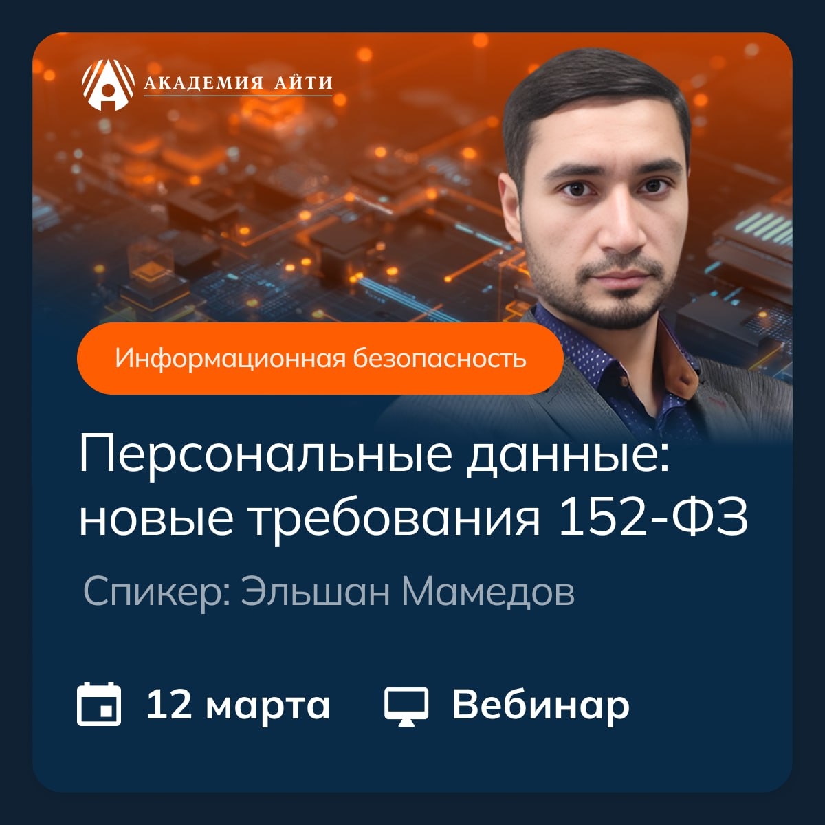 ? Тему разберёт Эльшан Мамедов — кандидат юридических наук, эксперт по защите информации, доцент Центра компетенций по кибербезопасности ИРНИТУ и преподаватель программ по информационной безопасности Академии АйТи. 12 марта проведём вебинар «Обработка персональных данных в новых реалиях: ключевые изменения в законодательстве и правоприменительной практике». На вебинаре разберём, как изменения в 152-ФЗ и КоАП РФ влияют на работу компаний с персональными данными: какие нарушения чаще всего выявляются при проверках, как регуляторы оценивают работу по защите персональных данных и как компаниям действовать при утечке персональных данных. Во время эфира можно будет задать эксперту вопросы по своей рабочей ситуации. 12 марта 2026 | 11:00–12:30 (МСК) | участие бесплатное РЕГИСТРАЦИЯ НА ВЕБИНАР #152ФЗ #персональныеданные #информационнаябезопасность