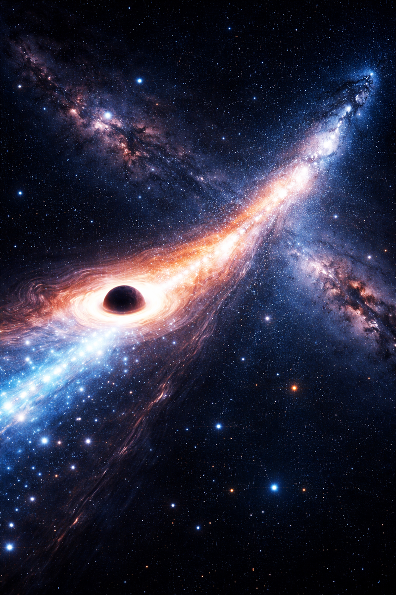В космосе обнаружили объект, который ведёт себя почти невероятно. Огромная сверхмассивная чёрная дыра не просто вращается в центре галактики, как большинство таких объектов, а буквально летит через космос, оставляя за собой гигантский след из раскалённого газа. По оценкам астрономов, её скорость может достигать миллионов километров в час. Для сравнения: это в тысячи раз быстрее скорости самолёта и в десятки раз быстрее, чем движется наша Солнечная система вокруг центра галактики. Но самое удивительное — учёные смогли увидеть огромную светящуюся линию длиной сотни тысяч световых лет, которая тянется за этой чёрной дырой, словно космический след. След, который тянется через половину галактики Астрономы заметили необычную структуру при наблюдении далёкой галактики с помощью космических телескопов. Она выглядела как длинная и тонкая полоса света, протянувшаяся на расстояние около 200 000 световых лет. Для понимания масштаба: это почти вдвое больше диаметра нашей галактики Млечный Путь. По