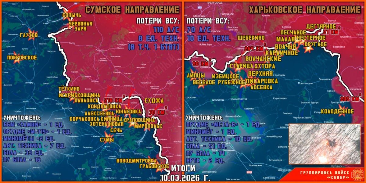 К утру 11 марта появились новые подробности формирования полосы безопасности в Харьковской и Сумской областях Украины, в том числе на подступах к госгранице с Курской областью России. Штурмовики Северян ведут ожесточенные бои, продвигаясь вглубь Сумской области. Нанесены удары в районах Глухова, Искрисковщины, Корчаковки, Мирополья, Павловки, сёл Суходол, Кияница и Храповщина. Ожесточенные бои идут восточнее Бобылевки в Шосткинском районе, где противник хочет удержать позиции, используемые ВСУ для ударов по гражданской инфраструктуре Брянской и Курской областей. ВСУ перебрасывают резервы из состава пограничной службы в район села Сопыч, за которое продолжаются ожесточенные бои. Отдельные сообщения об освобождении населенного пункта пока не соответствуют действительности.