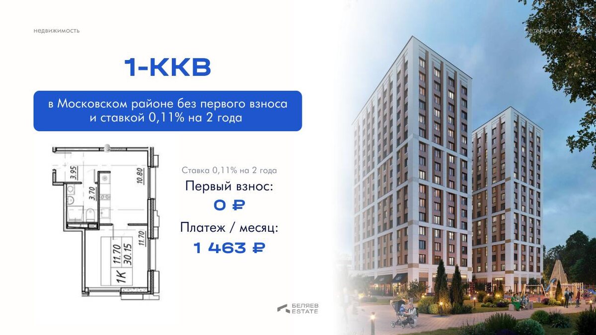 Однокомнатная квартира с чистовой отделкой у метро «Звёздная». Сдача уже 3 квартале 2026 года. Расчёт: • первый взнос — 0 ₽ • платёж на 2 года — 1 463 ₽ Что входит в квартиру: • чистовая отделка — полы, натяжные потолки, обои под покраску, плитка и сантехника в санузле • возможность меблировки с техникой за дополнительную плату • возможность аренды кладовой для хранения сезонных вещей Инфраструктура комплекса: • консьерж-служба 24/7, химчистка, прачечная • спортзал, коворкинг, мини-маркет, салон красоты, ресторан на первых этажах • благоустроенная территория с зонами для спорта, игр и отдыха • 8 минут пешком до метро «Звёздная» • Московский район — престижная локация с развитой инфраструктурой Идеальный вариант в качестве первого жилья в Петербурге, для студента или инвестиций. 👉🏻 Оставьте заявку — покажем квартиру и зафиксируем условия