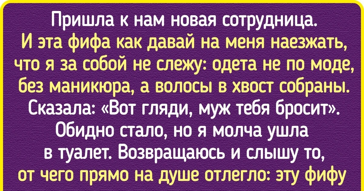Пришла к нам новая сотрудница. И эта фифа как давай на меня наезжать, что я за собой не слежу: одета не по моде, без маникюра, а волосы в хвост собраны. Сказала: «Вот гляди, муж тебя бросит». Обидно стало, но я молча ушла в туалет. Возвращаюсь и слышу то, от чего прямо на душе отлегло: эту фифу вовсю пропесочивает наша старшая у себя в кабинете: «Думаешь, она не хочет красиво краситься или одеваться? Хочет, но не может, а муж ее и такую любит. У них двое деток маленьких, свекровь с ними больная живет. Нужны постоянно дорогие лекарства, она с мужем работает без отпусков уже 5 лет, да еще и на двух работах. Какой тут может быть макияж, она и поспать не всегда может. Так что даже не вздумай ее еще раз этим упрекнуть — вмиг вылетишь с работы». Я была в шоке не только от того, что она заступилась, но больше из-за того, что она в курсе моих проблем... Теперь понятно, почему наша добрая начальница обеспечивала меня хорошо оплачиваемыми подработками и на премию не скупилась.