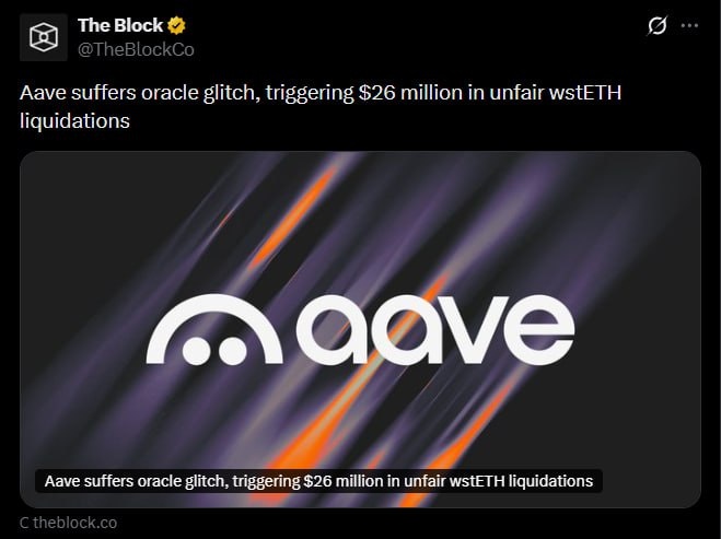 Вчера Correlated Asset Price Oracle (CAPO) установил обменный курс для wstETH в размере 1,1939. Однако реальное соотношение составляло 1,22850. ▪️ В результате произошла ликвидация 34 кошельков на сумму в 10 938 wstETH ($27 млн). Сейчас AAVE разрабатывает план компенсаций для пользователей. Держишь себе спокойно кредит — и вдруг тебя ликвидируют по выдуманному курсу 👍 Зарабатываем вместе | Мерч | Экосистема Crypton