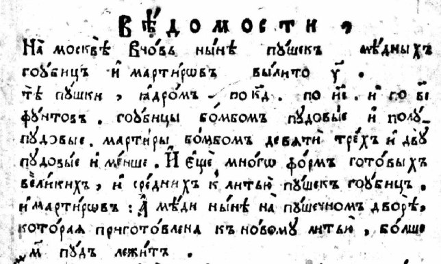 Нынче новости совсем не радуют. Согласитесь? Тут взрывы, там убили, здесь украли, эти обманули тех, те издеваются над этими и т.д. и т.п. Давайте отвлечемся и почитаем новости... из прошлого. Вашему вниманию "Ведомости" от 2 января 1703 года, Москва. Что-то в те времена покажется забавным, что-то интересным, а что-то точно таким же как и в современных новостях. В Москве вновь ныне отлито ладных гаубиц, пушек и мартиров. Гаубицы пудовые и полупудовые; пушки до 12 фунтов; мартиры - двупудовые и меньше. Меди ныне на пушечном дворе, которые приготовлены к новому литью, больше 40 пудов лежит. Из Персиды пишет: Индейский царь послал в дарах великому Царю нашему слона и иных вещей немало. Из града Шемахи отпущен он в Астрахань сухим путем. На реке Соку нашли много нефти и медной руды. Из той руды выплавили меди изрядно, от чего чают немалую быть прибыль московскому государству. Из Сибири пишут: в Китайском государстве иезуитов не стали любить за их лукавство, а иные из них и смертию казнены.